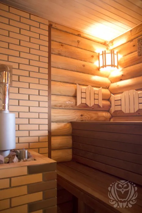 Просторная парная, печь с закрытой каменкой для создания легкого пара чтобы париться с вениками. Светильники в парной сделаны из гималайской соли!