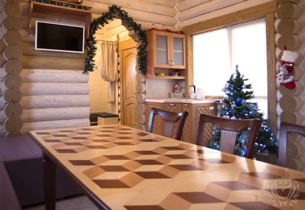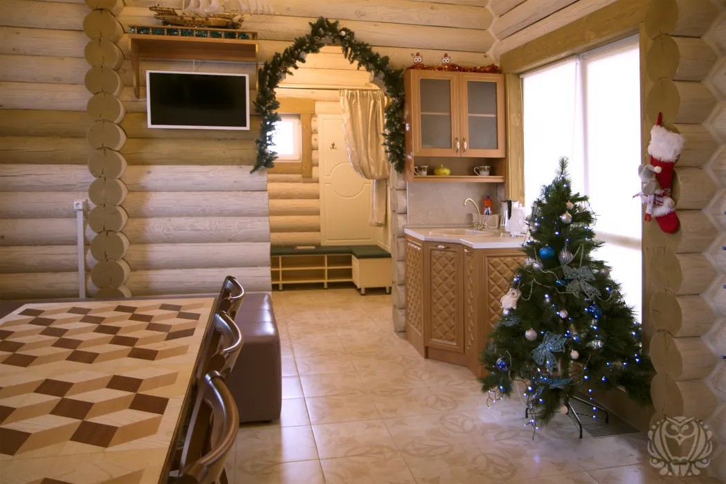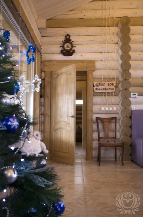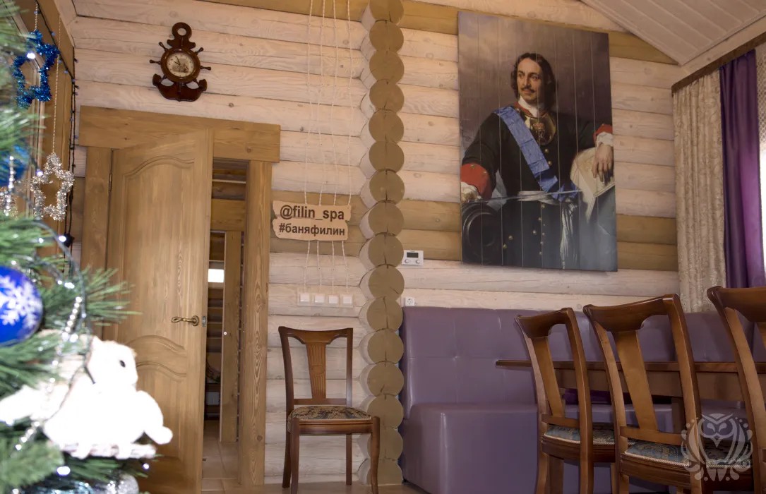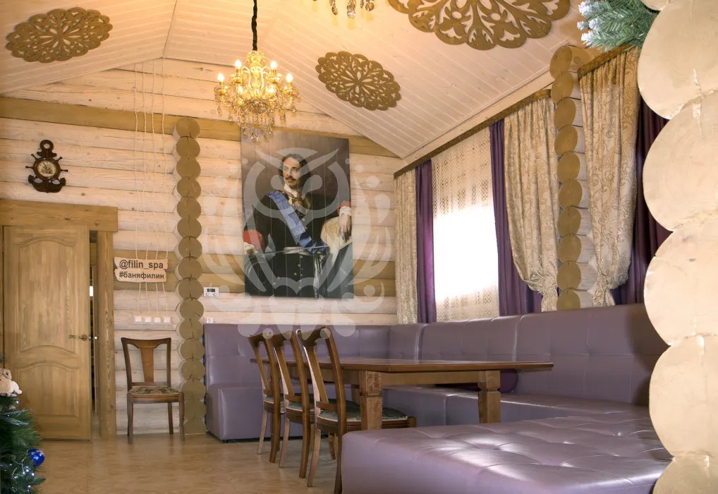 В интерьере бани присутствует морская тема: настоящая корабельная рында на стене, корабельный штурвал, высокие потолки, хрустальные люстры. Есть огромный диван, стол для больших компаний.