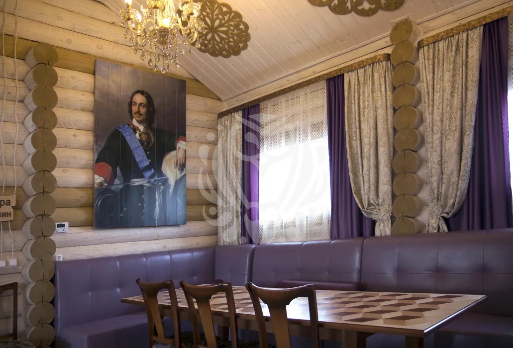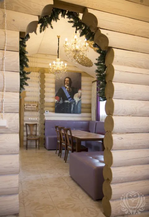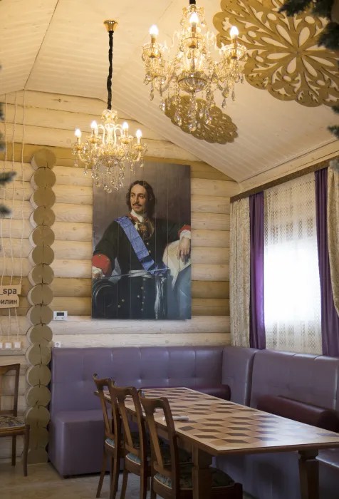 Царская баня - это большой сруб-терем. Баня обставлена в духе времен Петра 1.