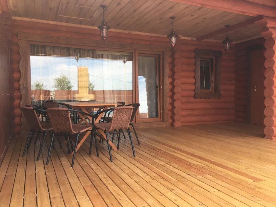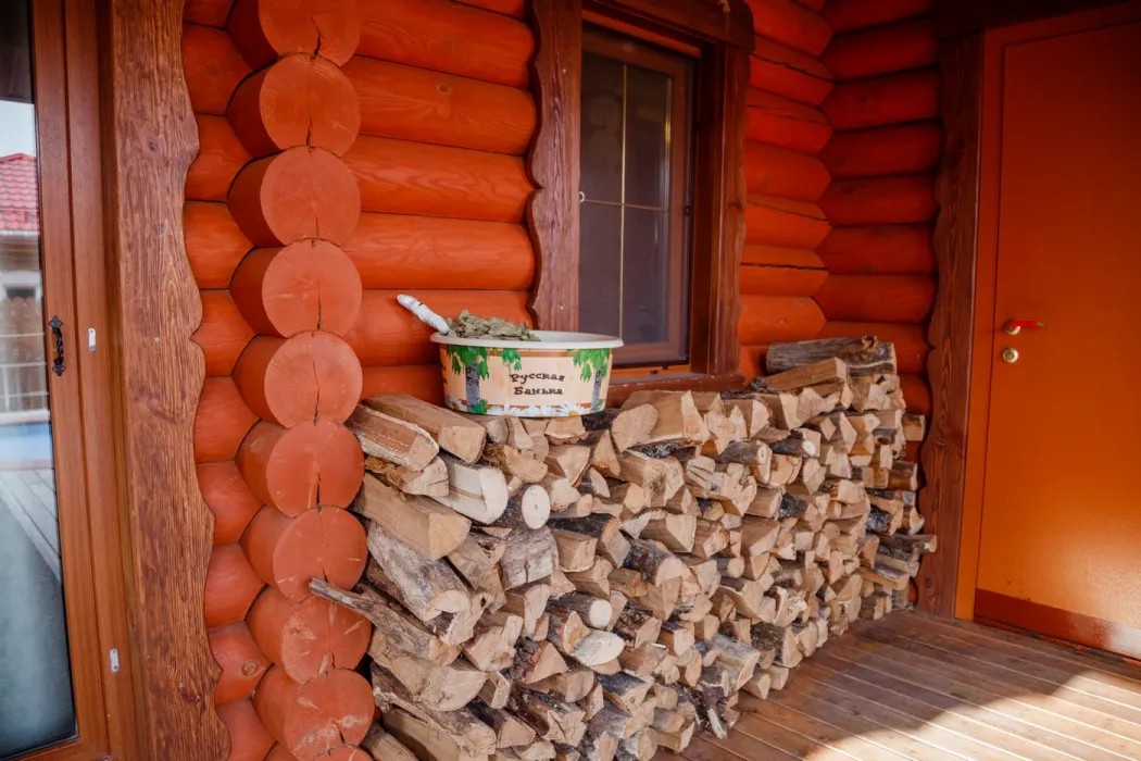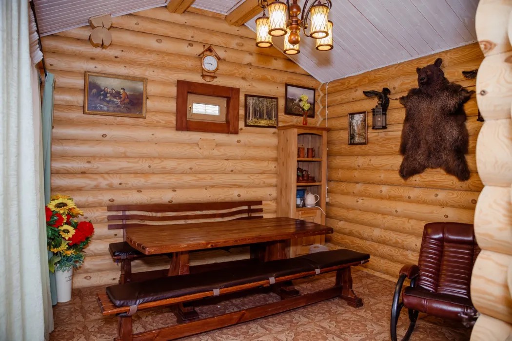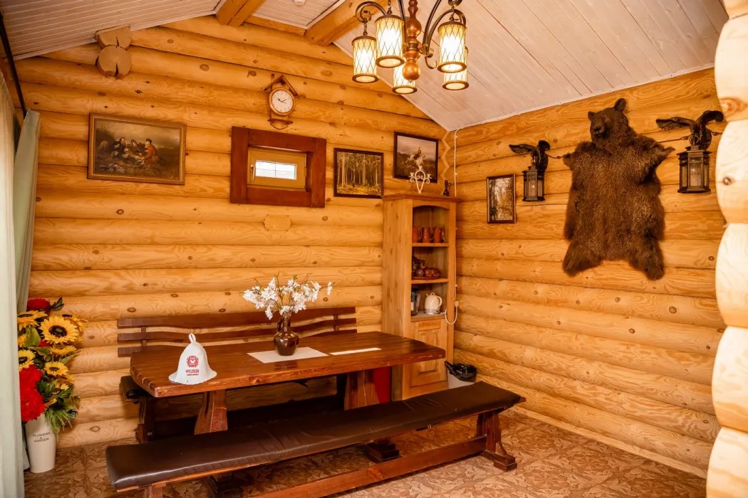 Баня выполнена из сруба в русских традициях, интерьер выполнен в стиле домика охотника с тематическими картинами на стенах.